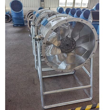 Ventilador axial con paso ajustable, diseñado para proporcionar una potente refrigeración y ventilación localizada a los operarios de talleres, fundiciones u otras áreas de trabajo con altas temperaturas.